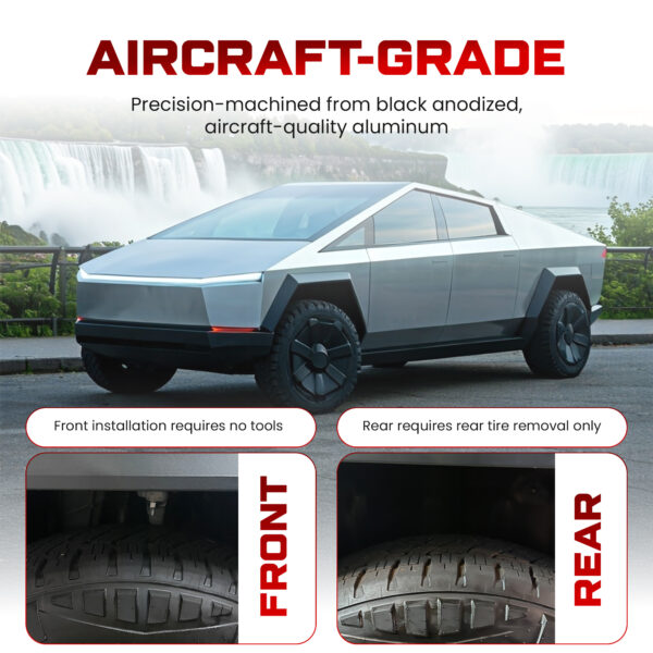 Crafted from aircraft-quality black anodized aluminum, the Lowering Rod Kit is designed to withstand the rigors of both daily driving and challenging terrains. Its robust construction ensures long-lasting reliability, while its precise engineering maintains factory settings without suspension errors, allowing for seamless integration with your OEM suspension. Installation is straightforward and hassle-free, thanks to the detailed instructions included with the kit. No modifications or specialized tools are required, making it easy for you to enjoy the benefits of a lowered Cybertruck quickly.